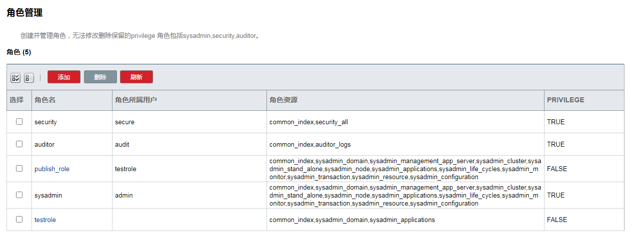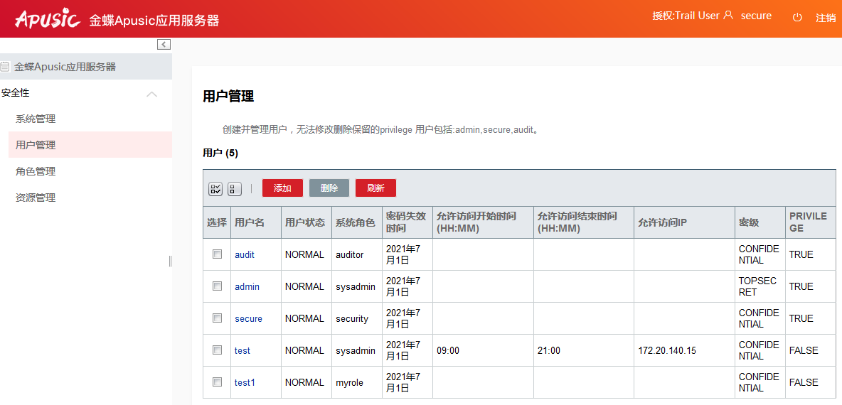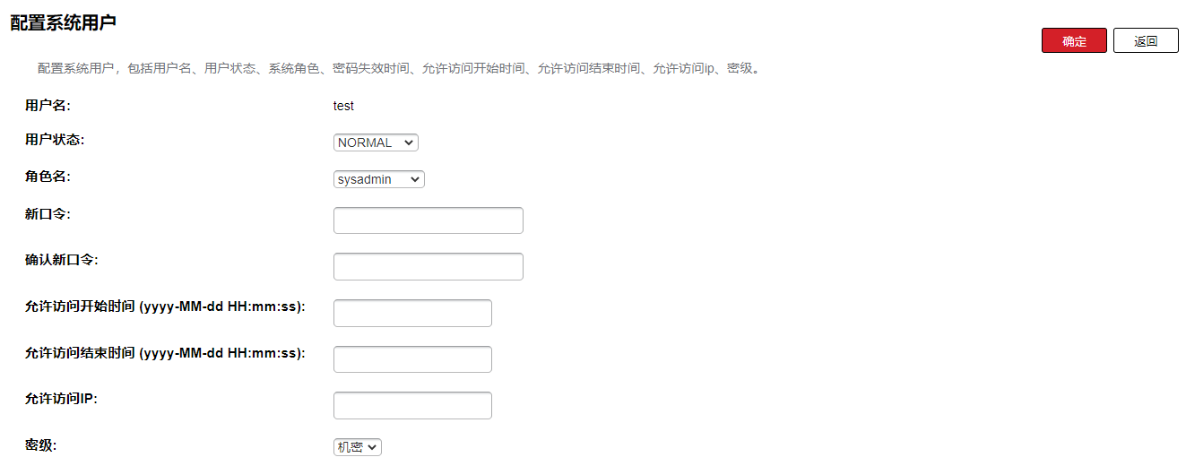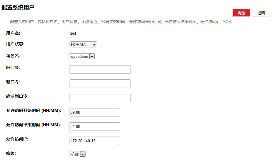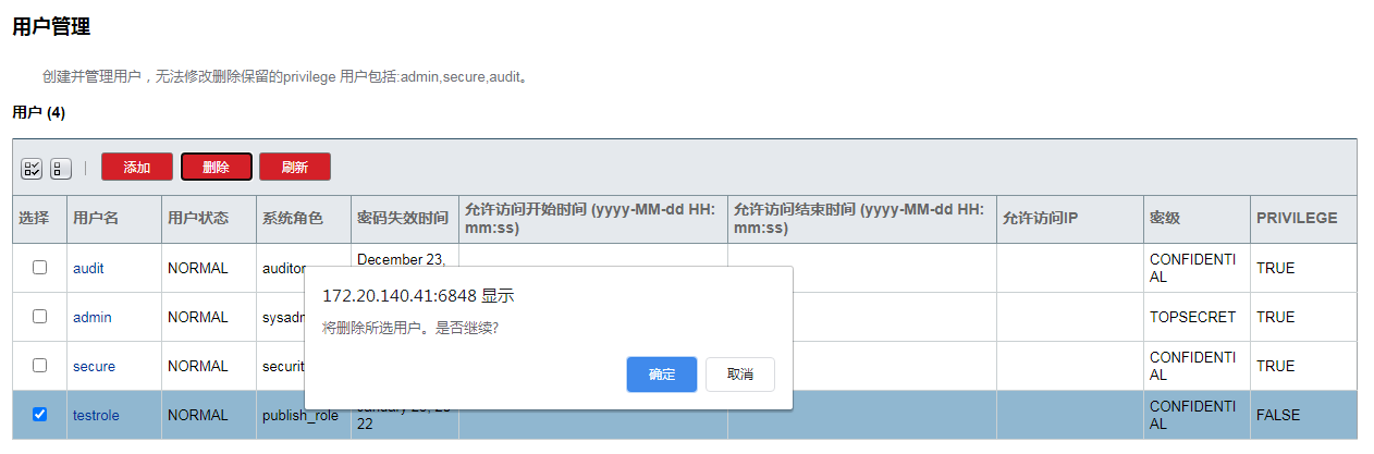 用户名 用户名密码 角色 类型(PRIVILEGE为默认类型即是默认三个用户(admin,secure,audit) 其它新增的用户为NORMAL)
