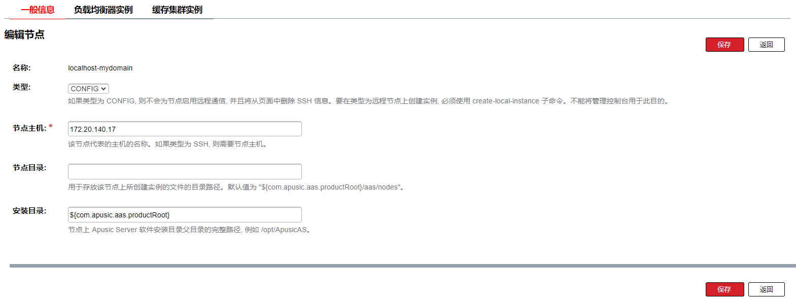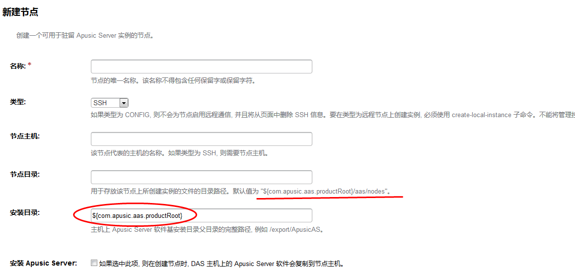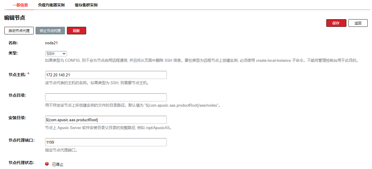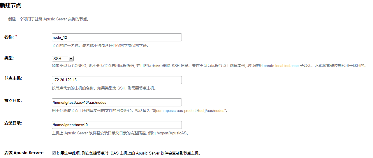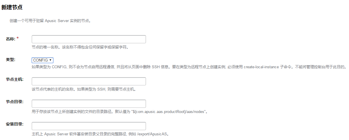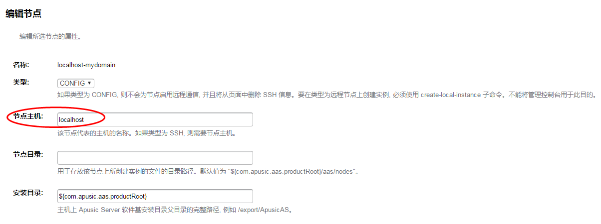 每个节点对应一台装有应用服务器软件的主机,应用服务器实例所在的主机上必须存在一个对应的节点。节点配置信息包含主机名称,以及应用服务器安装在主机上的位置。